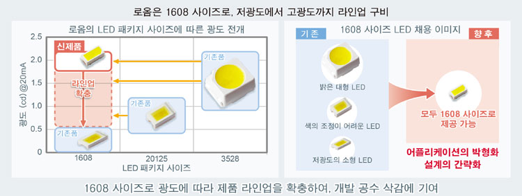 로옴은 민생기기용으로 업계 최소 수준의 1006 사이즈 PicoLED™ 및 자동차 전장기기용으로 고신뢰성 1608 사이즈의 ExceLED™를 개발하는 등, 다양한 어플리케이션용으로 소형 LED의 개발 실적을 보유하고 있다.