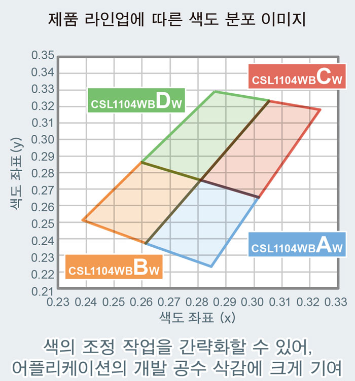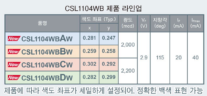 「CSL1104WB」는 기존에는 어려웠던, 고광도 2.0cd를 초소형 1608 사이즈 (1.6mm × 0.8mm = 1.28mm2)로 실현한 백색 LED다. 현재 주류인 일반품 3528 사이즈 (3.5mm × 2.8mm = 9.8mm2)와 동등한 광도를, 실장 면적이 87% 저감된 1608 사이즈로 달성했다. 동시에 백색 LED의 과제인 색의 편차를 개선하여, 정확한 백색 표현을 통해 색의 조정 작업을 간략화할 수 있다.