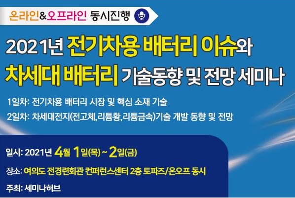 세미나허브, 2021년 차세대배터리 기술 전망 세미나 4월 1일~2일 개최해