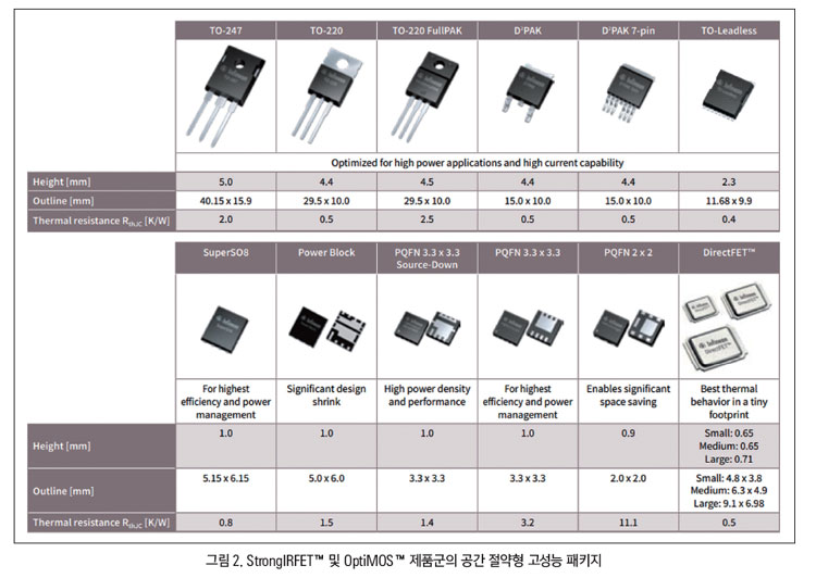 OptiMOS™ 제품은 탁월한 스위칭 성능과 함께 RDS(on)을 크게 감소시킨다. OptiMOS™ 제품군은 서버, 데스크톱 PC, 무선 충전기, 급속 충전기 및 OR-ing 회로에서 스위치 모드 전원 공급장치(SMPS)의 동기식 정류와 같은 다양한 애플리케이션과 회로에 최적화됐다. 또한 2012년에는 낮은 RDS(on)과 높은 전류 성능에 최적화되어 성능과 견고성을 요구하는 저주파 애플리케이션에 이상적인 StrongIRFET™ MOSFET 제품군을 선보였다. 패키징 혁신 또한 인피니언 MOSFET 개발의 중심에 있었다.