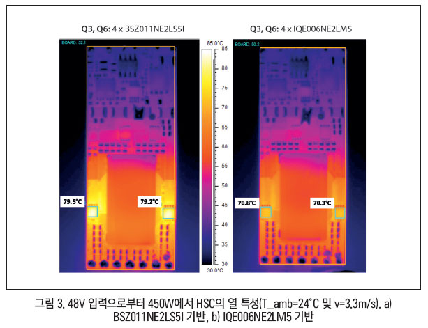 성능 이점을 비교하기 위해 두 버전의 8:1 HSC(hybrid switched-capacitor) 컨버터 보드를 검사했다. 하나는 표준 드레인 다운 디바이스(BSZ011NE2LS5I)를 기반으로 하고, 다른 하나는 새로운 소스 다운 디바이스(IQE006NE2LM5) 기반이다. 그림 2는 두 디바이스의 열 성능을 보여준다. 전통적인 패키지의 핫스팟(그림 3a)이 새로운 소스 다운 패키지에서 제거되는 것을 관찰할 수 있다(그림 3b).