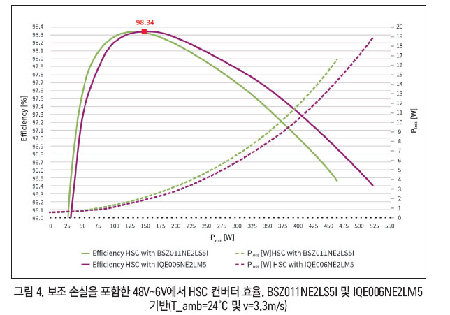 MOSFET의 표면 온도는 크게 향상돼 드레인 다운 디바이스에 비해 9°C 차를 보여준다. 그림 4는 효율 비교(보조 손실을 포함)를 보여준다. 새로운 소스 다운 디바이스를 사용하는 시스템의 높은 효율은 전력 밀도를 크게 증가시킨다.