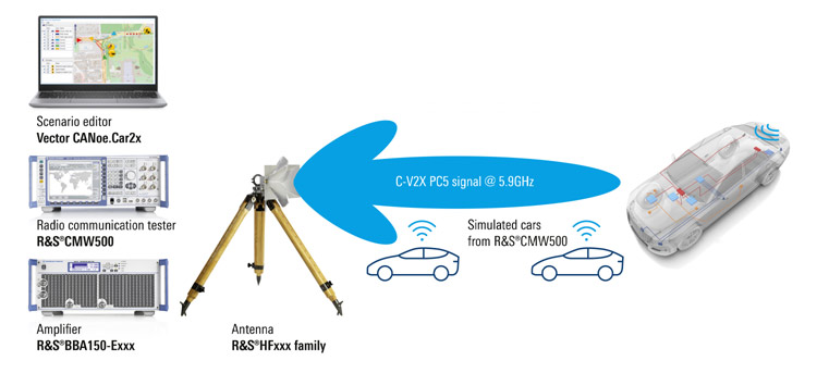 이 시스템은 R&S® CMW500 Radio Communication Tester와 R&S® SMBV100B 벡터 신호 발생기(연구소 전용), Vector CANoe Car2x 소프트웨어, R&S® BBA150 증폭기를 비롯해 삼각대 및 어댑터를 갖춘 R&S® HF918 안테나로 구성되어 있다. 이 시스템은 일부 시장(지역)에서 요구되는 최대 33dBm의 신호 출력을 쉽게 생성할 수 있다. 성능 시험장에서 시뮬레이션 차량과 테스트 차량을 실제 GNSS 소스와 동기화하여 복잡한 교통 시나리오를 실시간으로 검증할 수 있다.