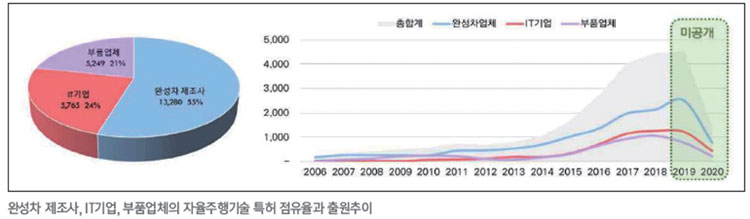 특허청의 자율주행기술 특허분석 결과에 따르면 완성차 제조사(토요타, GM, 현대차 등), IT기업(웨이모, 애플, 바이두, LG, 테슬라 등), 자율주행 부품기업(엔비디아, 벨로다인, 모빌아이 등 반도체?라이다 제조업체)이 특허출원을 활발하게 하고 있다.