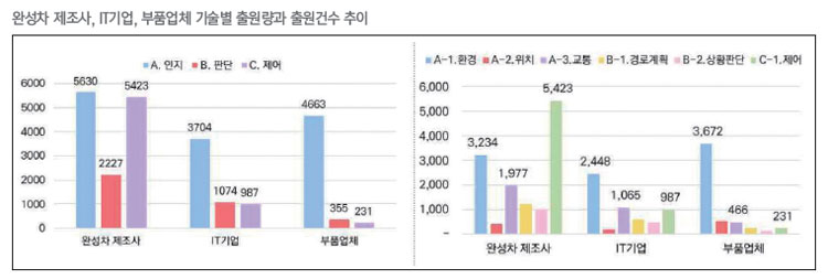 자율주행차 주요기술별로 살펴보면, 완성차 제조사는 인지(5,630건)와 제어(5,423건) 기술 분야에서 강점이 있고, IT기업과 부품업체는 인지(IT기업: 3,704건, 부품업체: 4,663건) 기술 분야에서 상대적으로 특허출원이 많은 것으로 조사됐다.