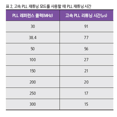 PLL 튜닝 시간은 ADRV9002의 PLL 레퍼런스 클럭 속도에 따라서 좌우된다. 표 2는 서로 다른 PLL 레퍼런스 클럭 속도에 따라서 필요한 고속 PLL 튜닝 시간을 보여준다. PLL 레퍼런스 클럭 속도가 300MHz일 때 고속 PLL 튜닝 시간은 약 15μs이다. Link 16은 호핑 프레임 길이가 13μs이므로, 표 1에서 보듯이 전이 시간이 2μs보다 길다면 PLL MUX 모드를 사용할 때 15μs의 PLL 튜닝 시간이 타이밍 요건을 충족할 것이다.
