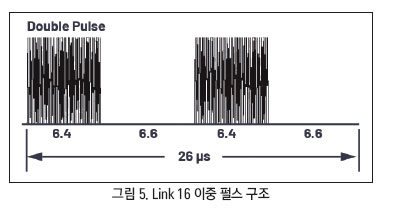 “협대역 간섭이 존재하는 가운데 저속 평탄형 나카가미 페이딩 채널을 통해서 전송된 JTIDS/Link 16 유형 파형의 성능 분석” 논문3에서 기술하고 있듯이, Link 16 메시지 데이터는 패킹 구조에 따라서 단일 펄스나 이중 펄스로 전송할 수 있다. 단일 펄스 구조는 6.4μs 온(on) 시간과 6.6μs 오프(off) 시간으로 이루어지므로 총 지속시간은 13μs이다. 이중 펄스 구조는 2개의 단일 펄스로 이루어지며 동일한 데이터를 서로 다른 캐리어 주파수를 사용해서 전송한다(그림 5). 그러므로 전이 시간이 6.6μs 길이일 수 있는데(>2μs), 이는 ADRV9002를 사용해서 Link 16 FH를 지원할 수 있다.