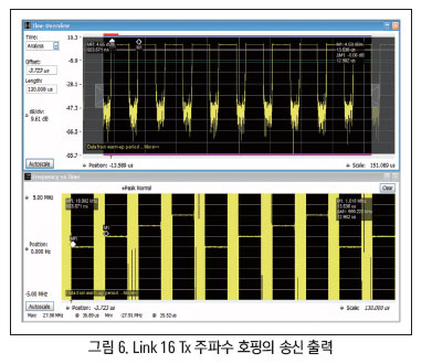 상단 플롯은 시간 대비 전력 성능을 보여준다. 연속적 송신 호핑 프레임들 사이에 약 3μs의 전이 시간으로 매 13μs마다 송신 호핑이 이루어지고 있는 것을 알 수 있다. 하단 플롯은 시간 대비 주파수 성능을 보여준다. 이 측정은 송신 캐리어 주파수를 1MHz 간격으로 4개 주파수를 순환하도록 설정한 것이다. 하단 플롯에서 송신 출력이 1MHz 간격으로 4개 주파수를 순환하는 것을 보면 전체 체류 시간에 걸쳐 주파수 정확도가 우수하다는 것을 알 수 있다.