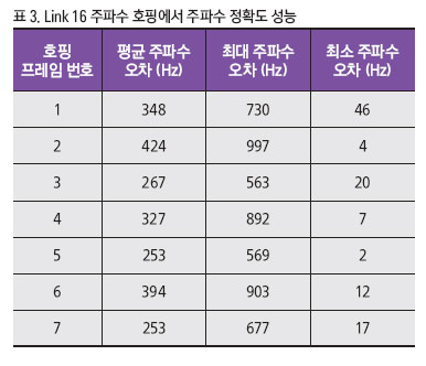 Link 16 FH의 주파수 정확도를 알아보기 위해서 키사이트(Keysight)의 E5052B와 R&S FSWP 같은 첨단 테스트 장비를 사용해서 추가적인 측정을 실시했다. 표 3의 측정은 송신 캐리어 주파수를 400MHz, 400.1MHz, 400.2MHz, 400.3MHz로 호핑한 것이다. 송신 입력은 모든 호핑 프레임으로 400MHz 출력을 발생하도록 구성했다. 측정 지속시간은 100μs로 설정했다. 이것은 7개 호핑 프레임에 해당한다. 매 128ns 시간 간격으로 주파수를 측정했다.