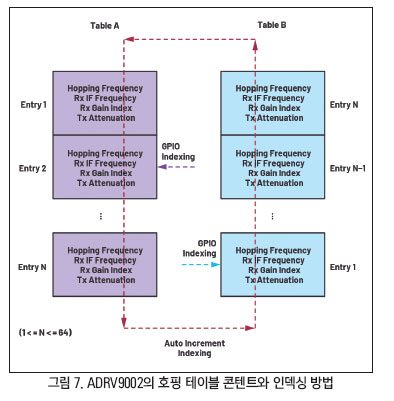 호핑 테이블 역시 핑퐁 방식으로 2개의 서로 다른 테이블을 선택적으로 로드할 수 있으며, 각 호핑 테이블마다 최소 1개에서부터 최대 64개 주파수 항목을 포함할 수 있다. 한 테이블을 현재 호핑 프레임에 사용하는 동안, 다른 테이블을 그 다음 호핑 프레임을 위해 준비시킬 수 있다. 각각의 항목은 특정 호핑 프레임에 사용될 구성을 ADRV9002에게 알려준다.