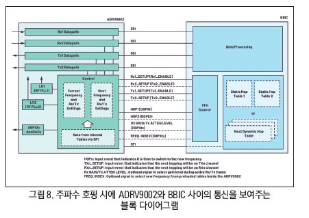그림 8에서 보듯이, BBIC가 FH 동작을 위한 메인으로서 동작하며 FH 모드, 채널 설정 신호(Rx1_ENBALE, Rx2_ENABLE, Tx1_ENABLE, Tx2_ENABLE), HOP 신호(HOP1과 HOP2), 정적 또는 동적 호핑 테이블(호핑 주파수, 수신 IF 주파수, 수신 이득, 송신 감쇠)을 설정한다. BBIC는 SPI 인터페이스나 DGPIO를 통해서 ADRV9002와 통신한다. ADRV9002가 FH 동작을 위한 노드로서 동작하며, BBIC로부터 신호들을 받고 그에 따라서 데이터 경로와 LO를 구성한다.