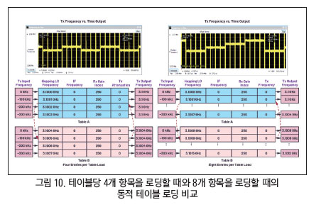 그림 10은 동적 테이블 로딩으로 로드당 4개 항목을 로드할 때와 8개 항목을 로드할 때의 시간 대비 송신 주파수 출력을 나타낸 것이다. 송신 입력은 0kHz, ~100kHz, ~200kHz, ~300kHz 주파수로 4개 프레임이고, 이 프레임들을 계속해서 돌아가며 ADRV9002로 전달한다. 이 경우에도 역시 호핑 프레임과 완벽하게 정렬하고 동기화함으로써, 0kHz 입력 프레임이 3.1GHz LO와 정렬한다. FH 동안, LO가 다음 주파수로 전환하면 송신 입력 주파수 역시 다음 주파수로 전환한다.