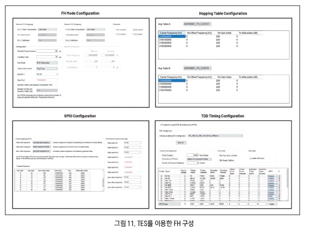 평가 보드와 함께 ADRV9002 TES를 사용해서 FH 성능을 평가할 수 있다. TES는 자일링스(Xilinx?) ZC706과 ZCU102 FPGA 보드를 지원한다2. 그림 11에서 보듯이, FH 구성 페이지에서 손쉽게 FH 파라미터를 구성할 수 있다(FH 동작 모드, 호핑 테이블, GPIO 설정, TDD 타이밍 등). 이 TES에는 FPGA 동기화 기능이 내장되어 있으므로, 송신 또는 수신 프레임이 호핑 프레임과 완벽하게 동기화되도록 TDD 타이밍을 세밀하게 제어할 수 있다. 또한 이 TES에는 사용자가 충분히 경험해 볼 수 있도록 많은 FH 예제들을 제공한다.
