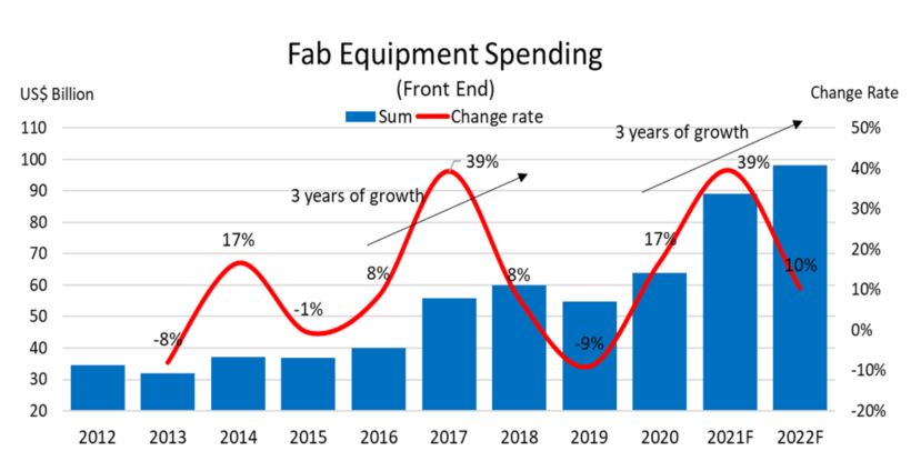 2021년의 글로벌 팹 장비 투자액은 2020년 대비 39% 상승할 것으로 보이며, 2020년은 2019년 대비 17% 증가하였다. 이와 같이 2020년부터 2022년까지 3년 연속 증가세를 보인 기간은 약 30년 전인 1990년대 중반과 2016년부터 2018년 기간이 마지막이었다.