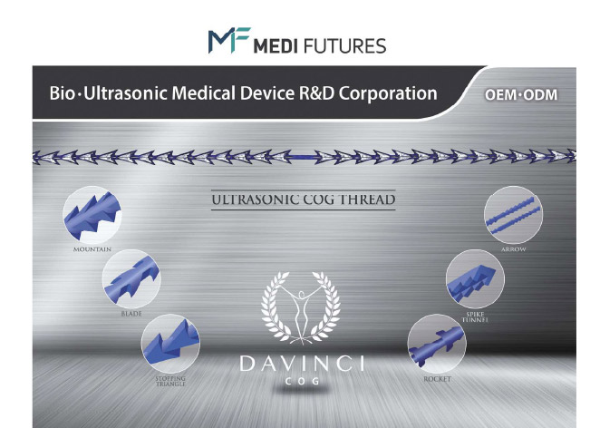 A. ‘다빈치코그(DAVINCI COG)’는 초음파를 이용하여 제작된 3차원 의료용실(Barbed Suture)입니다. 세계에서 최초로 초음파로 가공된 의료용실로서 미국, 유럽, 일본, 중국, 한국에 특허를 보유하고 있습니다. 다빈치코그는 기존 커팅과 열가공 방식 대비 모양이 정교하고 내구성이 우수한 제품으로 2018년 출시 이후 500만불 수출을 달성하고, 세계 1위 메디컬기업인 메드트로닉社가 개최한 컨퍼런스(Medtronic Innovation Conference)에서 최종 파트너사로 선정되어 협력을 진행하고 있습니다.