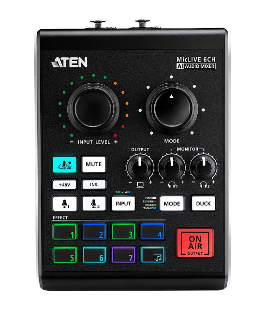 USB 오디오 인터페이스, 음성 효과 프로세서, 음향 효과 패드가 하나로 통합된 에이텐 최초의 오디오 믹서 장비다. 팟캐스트, 토크쇼, 오디오 라이브 스트리밍, 음악 애플리케이션 등 환경에서 오디오 효과를 아주 쉽고 간편하게 구현할 수 있는 장비다.