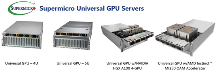 4U 또는 5U 범용 GPU 서버는 UBB 표준과 PCI-E 4.0 뿐만 아니라 곧 출시될 PCI-E 5.0을 사용하는 액셀러레이터에도 사용할 수 있다. 또한, 32개의 DIMM 슬롯과 다양한 스토리지 및 네트워킹 옵션을 사용할 수 있으며 PCI-E 표준을 사용하여 연결할 수 있다. 슈퍼마이크로 범용 GPU 서버는 엔비디아 NVLink 및 AMD xGMI 인피니티 패브릭과 같은 초고속 GPU-GPU 상호 연결을 활용하거나 PCI-E 슬롯을 통해 GPU를 직접 연결하는 SXM 또는 OAM 폼팩터의 베이스보드를 사용하여 GPU를 수용한다. 현재 모든 주요한 CPU 및 GPU 플랫폼이 지원되며 고객에게 정확한 워크로드에 맞는 선택권을 제공한다.