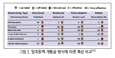 선성형술, 스텐트 시술, 우회로 이식술, 말초동맥 개통술 등이 있다[3]. 풍선성형술 및 스텐트 시술은 물리적으로 압력을 가해 혈관을 넓히기 때문에 노폐물이 남아 있고 허벅지에 위치한 대퇴동맥에서 관절의 움직임이나 근육의 압박에 의해 스텐트가 압박되어 골절을 일으키기도 한다[4]. 따라서 다른 치료 방식과 달리 근본적으로 죽상동맥경화증이 발생하는 원인인 노폐물을 제거할 수 있다는 장점이 때문에 말초동맥개통술에 대한 연구가 활발히 이루어지고 있다[10]. 그림 1에는 현재 상용화된 말초동맥 개통술 방식을 보여주고 있으며 각 방식 별 특성이 그림2에 정리되어 있다.