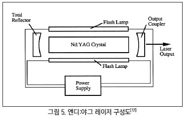 엑시머 레이저의 여러 한계점들로 인해 주목받는 레이저가 엔디:야그 레이저다. 엔디:야그는 고체 레이저에 사용되는 이득 물질 중 하나로 야그(YAG, Ytterium Aluminum Garnet)를 호스트(Host) 물질로 하여 네오듐(Nd, Neodymium)을 소량 도핑한 물질이다. 이를 이득 물질로 사용해 구성한 레이저를 엔디:야그 레이저라 부른다(그림 5 참고).