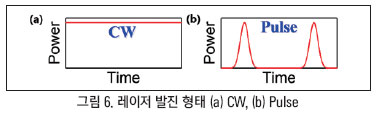 이를 통해 여기된 이득 물질이 자발방출을 시작하고 이로부터 유도된 자극방출이 연쇄적으로 일어나 동일한 특성을 갖는 광을 지속적으로 형성한다. 이 때 형성된 광은 두 거울 사이에서 왕복을 하며 증폭되어 레이저가 발진하게 된다. 이렇게 형성된 레이저는 펌핑 광원이 연속파(CW, Continuous Wave)인지 펄스(Pulse)인지에 따라 연속파 혹은 펄스 레이저로 나뉘게 된다(그림 6 참고). 연속파는 시간에 따라 출력이 일정한 반면 펄스 레이저는 특정 시간 동안 높은 에너지를 출력한다. 일반적으로 말초동맥 개통술은 고에너지 초단파 펄스가 필요하기 때문에 펄스 레이저를 이용한다.