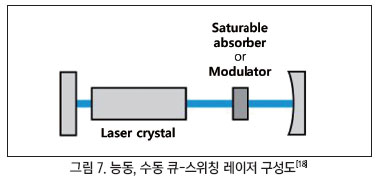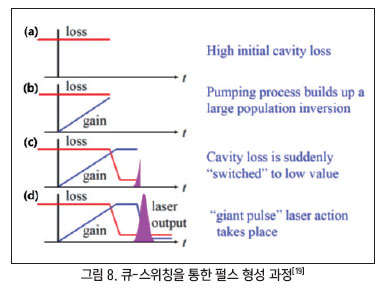 포화 흡수체는 특정 에너지 이하의 광만 흡수하고 임계점을 넘어가면 포화 상태가 되어 에너지를 흡수하지 못하게 되는 물질이다. 따라서 흡수 여부에 따라 큐가 조절된다. 반면 변조기는 전기 신호의 인가 여부에 따라 큐를 조절한다. 큐-스위칭을 통해 펄스를 형성하는 과정이 그림 8에 자세히 설명되어 있다.