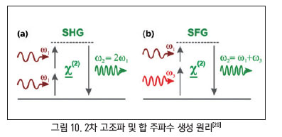 고조파 생성은 높은 2차 비선형 계수를 갖는 물질과 광자가 상호과정을 거쳐 다른 주파수를 갖는 광자로 변환되는 과정을 말한다. 일반적으로 다른 주파수로 변환을 위한 방식은 2차 고조파 생성(SHG, Second Harmonic Generation), 3차 고조파 생성(THG, Third Harmonic Generation), 차 주파수 생성(DFG, Difference Frequency Generation), 합 주파수 생성(SFG, Sum Frequency Generation) 등 다양한 방식이 존재한다.