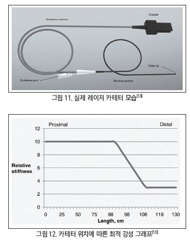 카테터의 구성은 그림 11에서 보이듯이 레이저와 연결되는 커플러(Coupler)와 거리를 연장시켜주는 연장부(Extenstion Section), 플라크의 위치를 찾기 위한 가이드선 포트(Guidewire Port), 동맥에 직접 삽입되는 부분인 작업부(Working Section), 레이저 에너지가 전달되어 노폐물을 제거하는 말초 첨단부(Distal Tip)로 구성된다.