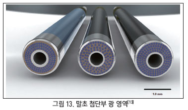 다섯 번째는 광 영역(Optical area)이다. 이는 카테터의 끝부분에서 발광하는 표면적의 합으로 정의된다. 시술 시 플라크가 제거되는 면적과 관계가 되어있는 특성이다. 일반적으로 사용되는 광섬유와 달리 레이저 카테터에 사용되는 광섬유는 코어(Core)와 클래딩(Cladding) 부의 비율이 1:1.1 혹은 1:1.05로 코어의 크기가 상대적으로 크다. 이는 더 넓은 광 영역을 확보하기 위한 방식으로 방사선이 방출되지 않는 클래딩의 비율을 최대한 낮춘 것이다. 그림 13은 카테터 말초 첨담부를 확대한 사진으로 파란색 동그라미 영역이 광 영역이며 레이저가 방출되는 부분이다. 이처럼 용도에 따라 다양한 형태의 광 영역 카테터를 활용한다.