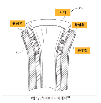 첫 번째는 기존의 기계적 절단 방식의 커터와 레이저 방식을 결합한 하이브리드 카테터를 제시하고 있다(그림 17 참고). 이 방식을 통해 레이저로 플라그를 제거 및 조직을 약화시켜 1차적으로 노폐물을 제거하고 레이저로 제거되지 않은 노폐물 및 조직을 기계적 수단인 커터로 제거하는 기술이다.