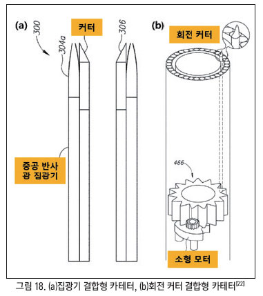 레이저가 조직을 경화시키기 때문에 단순히 기계적 방식으로 제거하는 것에 비해 분쇄가 용이하다. 또한 레이저로 발생하는 열손실과 기계적 방식의 스트레스를 서로 보완해주기 때문에 섬세한 조직 분리에 사용 가능하다는 장점이 있다. 두 번째는 광 집광기와 회전 칼날을 적용한 카테터 기술이다(그림 18 참고). 그림 18 (a)는 반사 광 집광기를 커터 외부에 포함한 것으로 금속 또는 유전체 코팅을 통해 방사선을 집광시켜 커터를 둘러싸는 균일할 펄스 방사선 링을 형성한다. 그림 18 (b)는 커터를 포함한 카테터이다. 해당 기술은 소형 모터로 회전시키는 커터를 적용한 카테터 시스템이다. 칼날의 회전을 통해 부족한 힘을 보충할 수 있다는 장점이 있다.