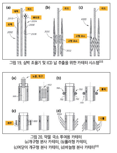 그림 20(b)의 경우 롤러가 포함되어 약물 전달의 효율을 증대시키고 스텐트 내 재협착시 스텐트를 확장하는데 응용되기도 한다. 그림 20(c)는 카테터 하우징에 개구부가 내장되어있고 필요할 때만 열려 약물을 도포시킨다. 마지막으로 그림 20(d)는 약물 투여를 위한 바늘이 어레이 형태로 구성되어 있어 카테터의 이동방향에 따라 바늘의 방향이 바뀌며 약물을 도포하는 방향을 조절할 수 있다.