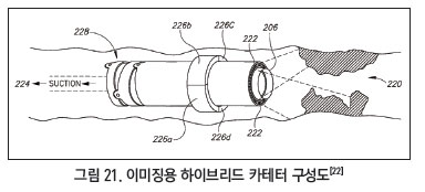 그림 21은 혈관 이미징을 위한 하이브리드 카테터의 구성도이다. 레이저 방사에 사용되는 카테터 광섬유 다발 중 일부를 혈관에서 반사 및 산란되는 빛을 수용하는 역할로 활용하여 이미지에 사용하는 시스템이다. 일반적인 카테터는 실제로 내부를 관측하지 않기 때문에 의사의 감각에 의존해야 하므로 시술에 어려움이 있다. 때문에 해당 기술을 이용해 되반사 되는 빛을 광섬유로 받아 광학 이미징 장치와 연동하면 시술 시 환자나 혈관이 받는 스트레스를 최소화 할 수 있다. 또한 카테터 흡입부가 존재하여 레이저 및 칼날로 제거된 파편을 흡입하여 제거해주는데 도움이 되는 기술이다.