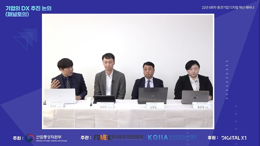 ‘중견기업의 DX 추진 이슈 및 해법 ’ 페널 토의 장면 (좌측부터 KOIIA 추현호 부단장, 디지털엑스원 임창현 파트너, 인덕대학교 김창원 특임교수, 에스넷시스템(주) 홍윤정 부장)이러한 배경 속에서 한국산업지능화협회와 한국중견기업연합회는 산업부 주최로 중견기업의 디지털 전환을 지원하고자 디지털 기술 활용방안, 디지털 혁신 아이디어, 디지털 전환 추진 이슈 등을 다루는 중견기업 디지털 혁신 웨비나를 실시하고 있다.