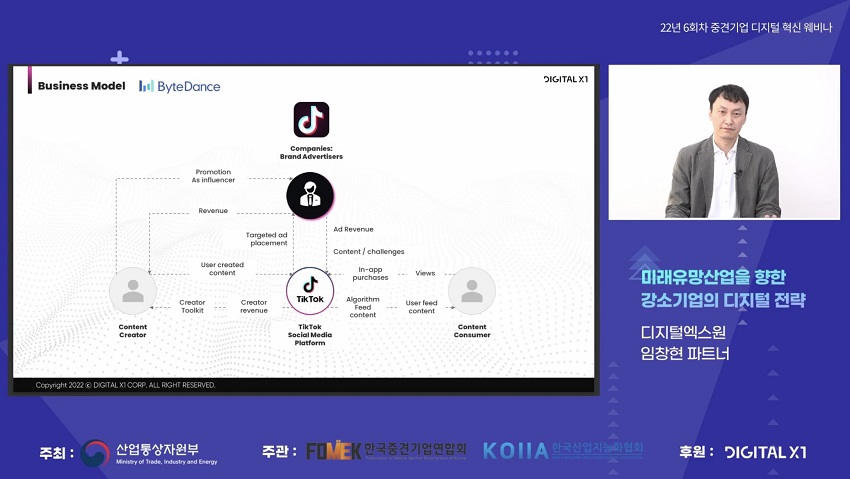 첫 번째 웨비나 연사로 나선 디지털엑스원 임창현 파트너는 글로벌 유니콘 기업들의 공통적인 성공 요인으로 디지털 네이티브 플랫폼 전략, 데이터 기반 가치 창출 등을 손꼽으며 디지털 전환 중견기업들을 위한 인사이트를 제공했다.
