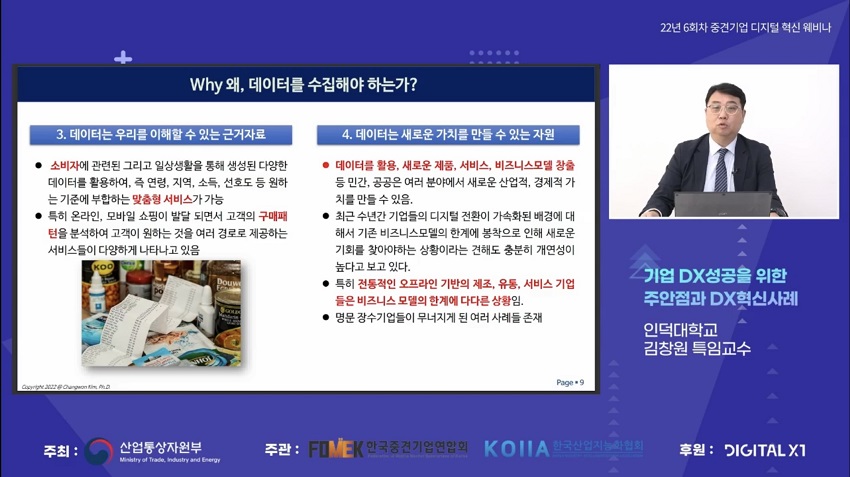 인덕대학교 김창원 특임교수의 발표 화면디지털 혁신 웨비나를 총괄하고 있는 한국산업지능화협회 추현호 부단장은 “성공적인 디지털 전환 추진을 위해서는 전사 차원의 빅픽쳐와 함께 프로젝트별로 목적 중심의 데이터를 수집·분석·활용하여 성공 경험을 축적하는 것이 중요하다”고 강조하며, “기업의 성공적인 디지털 전환 추진을 위한 다양한 프로그램과 지원제도를 만들어 나가겠다”고 설명하였다.