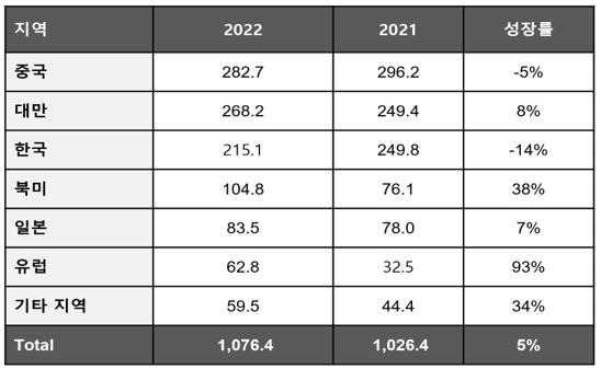 대만은 2021년 대비 8% 증가한 268억 달러를 기록하여 4년 연속 성장세를 보였다. 다음으로는 한국이 2021년 대비 14% 감소한 215억 달러의 매출액을 기록하였다. 유럽은 2022년 63억 달러로 전년 대비 무려 93%의 높은 성장세를 보였다. 북미지역 또한 38%의 높은 성장세를 보여 105억 달러의 매출액을 기록하였다.