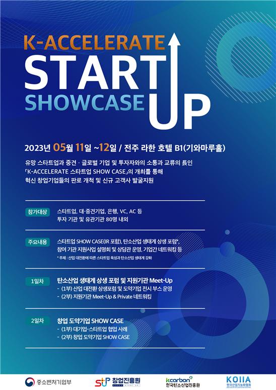 한국산업지능화협회(이하 ‘협회’)가 한국탄소산업진흥원(이하 ‘진흥원’)과 함께 ‘K-Accelerate 스타트업 쇼케이스’를 5월 11일부터 12일까지 전주시 소재 라한 호텔에서 개최한다고 밝혔다.