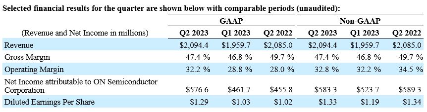 온세미가 자동차 부문이 전년대비 35% 증가한 2023년 2분기 실적을 발표했다.