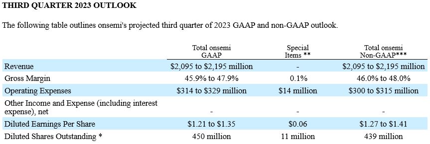 온세미의 2023년 2분기, 2023년 1분기, 2022년 2분기 재무 결과 비교(위)와 2023년 3분기 일반회계기준 및 비일반회계기준 전망