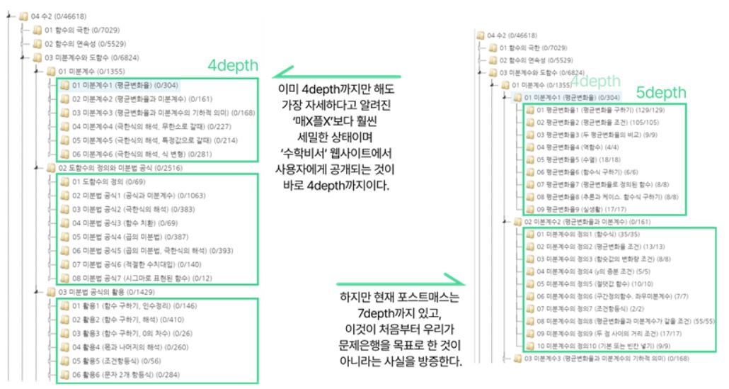 포스트매스가 처음부터 글로벌 SaaS기업(국가, 커리큘럼에 상관없이 작동)이 되기 위한 확장성 있는 DB구조를 만들었다. 아이디어를 원자단위로 쪼개서 Tag화 하는게 글로벌에 중요한 이유가 있다. 예를 들어보면 일본은 함수 – 삼각함수 - 지수함수와 로그함수 – 수열과 같은 순서로 배운다. 우리나라와 차이가 있지만, ‘분류된 Tag의 위계’만 정해주면 위와 같은 순서로 문제를 자동으로 분류하여 새로운 트리구조를 쉽게 만들 수 있다.