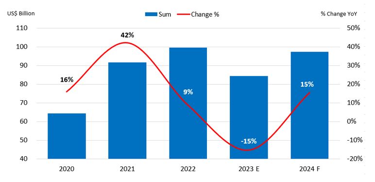 수출 통제로 인해 중국의 투자가 제한될 것으로 예상됨에 따라 중국의 2024년 전 세계 반도체 팹 장비 투자액은 올해 대비 감소한 200억 달러로 3위를 위치할 것으로 보인다. 하지만 다양한 제약에도 불구하고 중국 파운드리 및 IDM기업은 첨단 프로세스 노드에 대한 투자를 계속할 것으로 예상된다.