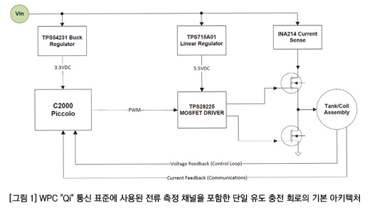 Piccolo 시리즈 디바이스는 통합된 고성능 아날로그 주변장치 프로세서뿐만 아니라 프로세싱 성능의 확장을 통해 유도 충전 애플리케이션에 탁월한 유연성을 제공한다. 32비트 프로세서 아키텍처는 12비트 멀티채널 ADC와 함께 제어 애플리케이션에서 고도의 정밀성을 제공하며 고해상도 PWM을 통해 하드웨어 설계자는 단일 디바이스를 가진 멀티채널 유도 충전 IC뿐만 아니라 더 우수한 전원 시스템 개발이나 통신 프로토콜 실행을 위한 유연성을 개발할 수 있다. 그림 1은 무선 전원 컨소시엄(WPC) “Qi” 통신 표준에 사용된 전류 측정 채널을 포함한 단일 유도 충전 회로의 기본 아키텍처를 보여준다.