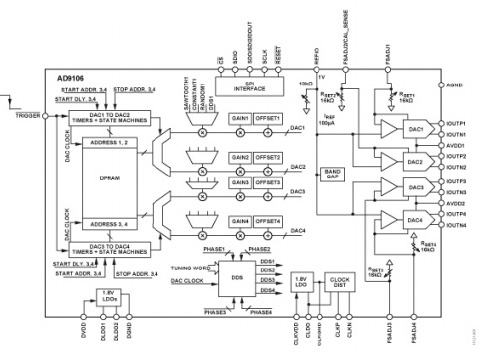 아나로그디바이스는 온칩 SRAM(static random access memory)과 DDS(direct digital synthesis)를 통합한 AD9106 쿼드-채널 12비트 및 AD9102 단일-채널 14비트 D/A 컨버터를 발표했다. 신형 D/A 컨버터는 초음파 트랜스듀서 여기(excitation), 의료용 측정 장비, 휴대형 측정 장비, 신호 발생기, 임의파형 발생기(AWG) 등과 같은 애플리케이션에서 요구되는 높은 동적 범위의 고속 멀티채널 복합 파형을 발생한다. 온칩 DDS는 24비트 튜닝 워드로 최대 180 MHz까지 동작해 10.8 Hz/LSB(최소유효비트) 주파수 분해능을 지원하며, 모든 D/A 컨버터에 대해 단일 주파수 출력을 제공한다. 또한 각 D/A 컨버터는 독립적으로 프로그래밍이 가능한 위상-변이(phase-shift) 출력을 제공한다. 패턴 데이터는 직접 생성되어 SRAM에 저장된 파형, 진폭 변조된 DDS 출력, 처프(chirp) 또는 DDS 주파수 튜닝 워드 등을 포함한다.