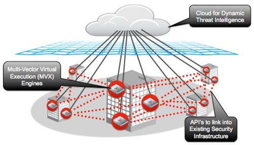 1. 멀티-벡터 가상 실행(MVX) 엔진 – 멀티벡터 가상 실행 엔진은 한층 진보된 가상 환경에서의 모바일 애플리케이션, 의심스러운 첨부 파일, 파일과 웹 오브젝티브를 제거함으로써 진화된 사이버 공격을 탐지하고 방어할 수 있도록 설계되었다. 이는 위협 벡터 전반에 걸쳐 사용되는 비시그니처 기반의 선도 기술로, 자동화된 악성 코드 탐지와 포렌식 분석을 진행하며 특정 조직을 대상으로 하는 공격에 대한 멀티-벡터 동적 위협 분석을 제공한다. 특정 기업을 위한 멀티 벡터 동적 위협 정보의 상관관계를 밝혀냄으로써 고객은 지능형지속공격(APT)에 의해 사용되는 침입 메커니즘을 사전에 차단할 수 있다.