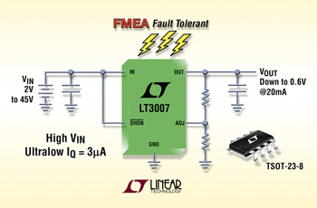 LT3007의 핀아웃은 FMEA (Failure Mode Effects Analysis) 에 대응된다. 따라서, 출력은 인접한 핀의 단락이 발생하는 경우와 어느 한 핀이 오픈되는 경우 출력 전압은 설정된 전압이나 그 이하의 전압으로 머물게 한다. 디바이스의 3µA 대기 및 셧다운(<1µA) 전류는 초저 대기 전력 소모를 실현시킨다. 이 같은 특징으로 IC는 셧다운이 필요하지 않는 애플리케이션을 위해 최상의 선택이 될 수 있으며, 동작 시간 연장을 요구하는 “킵 얼라이브(keep alive)” 시스템을 위해 원격 모니터링 및 저전류 배터리 구동 메모리처럼 적당한 출력 드라이브 성능과 고입력 전압을 요구하는 애플리케이션에도 적합하다.