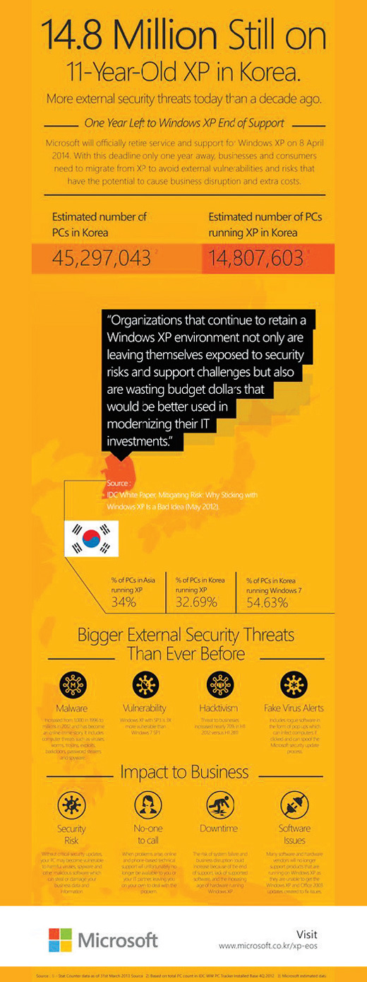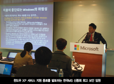 한국마이크로소프트의 신종회 최고보안책임자는 “해킹수법이 날로 지능화되는 상황에서 10년 이상 된 운영체제는 안전한 컴퓨팅 환경을 제공하는 데 한계가 있다”며 “윈도우 XP 지원 종료 이전에 시스템 환경을 상위 버전으로 전환해 보안 인프라를 강화할 필요가 있다”고 말했다.