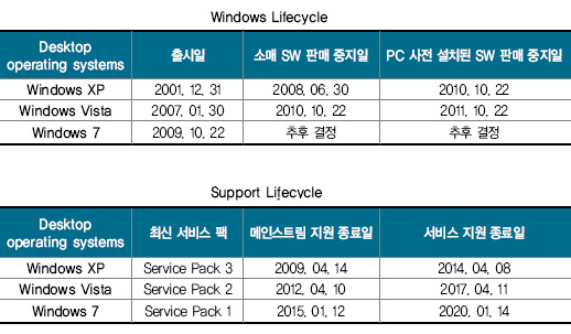 윈도우 XP는 가정용/업무용 컴퓨터와 노트북, 미디어 센터 등과 같은 컴퓨팅 시스템에서 사용 가능한 운영체제로 윈도우 2000의 후속 제품이다. 윈도우 XP는 윈도우 비스타가 출시함에 따라 2009년 4월과 2010년 7월 각각 서비스 팩 1, 2의 서비스가 순차적으로 종료된 바 있다. 한국MS는 PC의 안전한 사용을 위해 윈도우 XP 지원 종료 시점 이전에 윈도우를 상위 버전으로 전환할 것을 권고했다.
