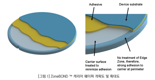 앞서 언급한 바와 같이, 새로운 TSV 제조 공정은 특히 전원 소자 또는 Wide I/O DRAM 제품을 위해 설계되었고 일반적으로 서로 다른 최적의 접착제를 사용할 필요가 있다. LowTemp짋 ZoneBOND™ 분리 공정기술은 혁신적이고 표준화할 수 있다 [2]. 이 기술은 분리 공정 캐리어 웨이퍼 기능이 필요하며 사용된 접착제에 따른 독립적인 분리 공정기술을 가능하게 한다. 그림 1에서 ZoneBOND 캐리어 웨이퍼 형태를 보여준다. 그림과 같이 웨이퍼의 가장자리 영역은 전체적인 접착력을 제공하는 반면, 중앙에는 접착력이 작은 영역이 된다.