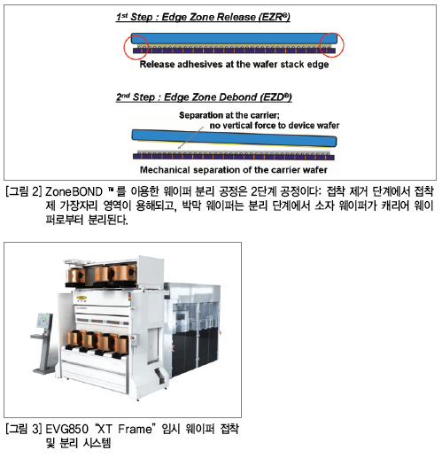 그림 2는 웨이퍼 분리 공정을 나타낸다. 첫째, 웨이퍼 가장자리 영역 제거(Edge Zone Release, EZR짋) 과정을 통해 가장자리 부분의 접착제가 단일 웨이퍼 모드에서 용해된다. 그리고 나면 소자 웨이퍼는 가장자리 분리(Edge Zone Debond, EZD짋) 과정을 통해 캐리어 웨이퍼로부터 분리된다. 그리고 박막 소자 웨이퍼는 필름 프레임부에 고정되고, 동시에 절단 및 어셈블리 공정이 가능해진다. 물리적 분리 공정은 캐리어 웨이퍼 접착 필름 사이의 경계면에서 발생한다. 이러한 물리적인 분리 공정 중에 범프는 안전하게 접착 필름에 붙어 있게 된다. 분리공정 중에는 범프에 무리한 힘은 가해지지 않는다. 이는 접착제 공급업체의 다양한 ZoneBond 재료 공급망을 통해 개방형 플랫폼이 가능해진다.
