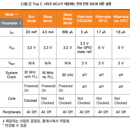 또한 HIB 모드 동안 칩이 활성화할 때까지 모든 GPIO 라인의 상태를 저장할 수 있다. 활성화되면 칩의 전원이 리셋되고 최대 500 μS의 실행 명령이 시작된다. Tiva C 시리즈 디바이스는 플래시의 80 MHz 풀 가동 모드에서 대개 30 mA를 소비한다. 전원 모드에 대한 전체 설명은 그림 2에서 확인할 수 있다.